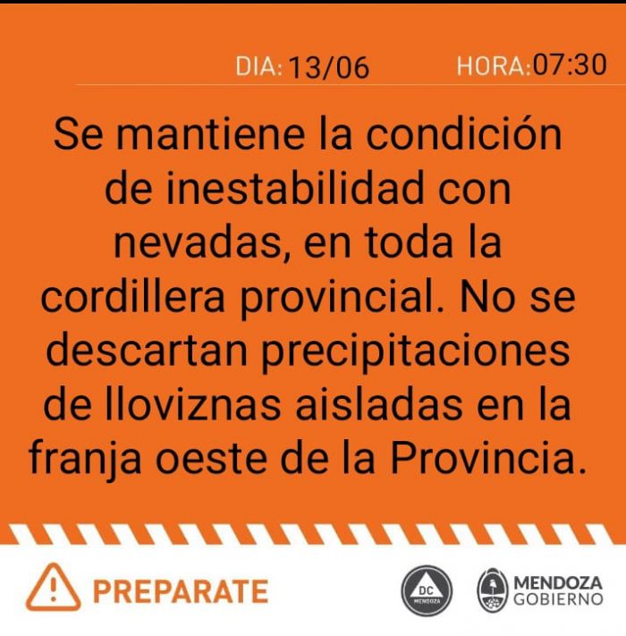Desde las 12:00, aproximadamente, circulación de viento leve con efecto zonda en Malargüe hasta las 18:00.