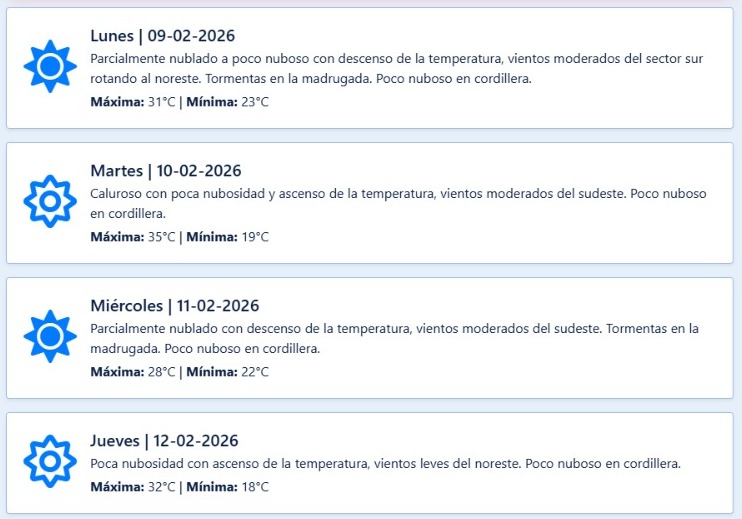 El cielo permanecerá despejado durante el día y parte de la noche. A partir de la medianoche comenzará la convección hacia la zona Este —La Paz— y el Valle de Uco, con probabilidad de lluvias durante la madrugada, extendiéndose hasta las primeras horas del miércoles.