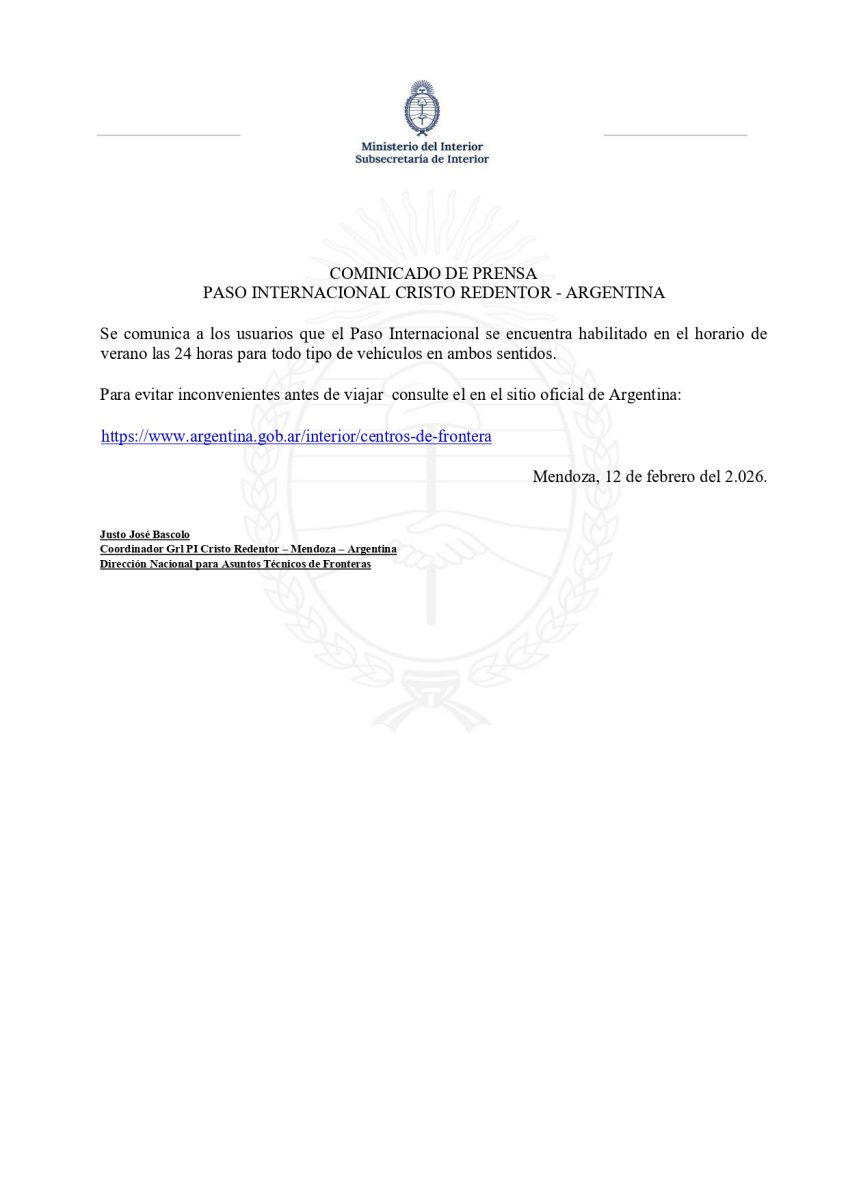 Paso Cristo Redentor: Habilitado las 24 horas para todo tipo de vehículos