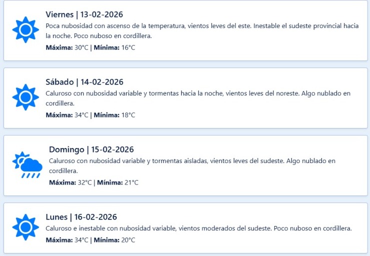 - Mínima: 16°C. (Malargüe y zonas bajas de Valle de Uco).