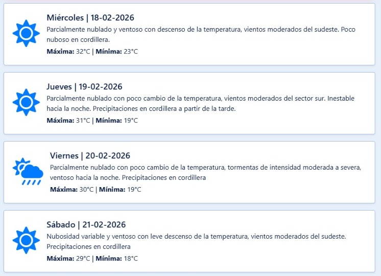 Nubosidad: inicia con cielo nublado en zona Este y Gran Mendoza, mejorando hacia las 10:00 hs. Posteriormente, entre las 14:00 hs. y la tarde, volverá a incrementarse la nubosidad en zona Norte, Este, Sur y Valle de Uco, sin precipitaciones previstas.