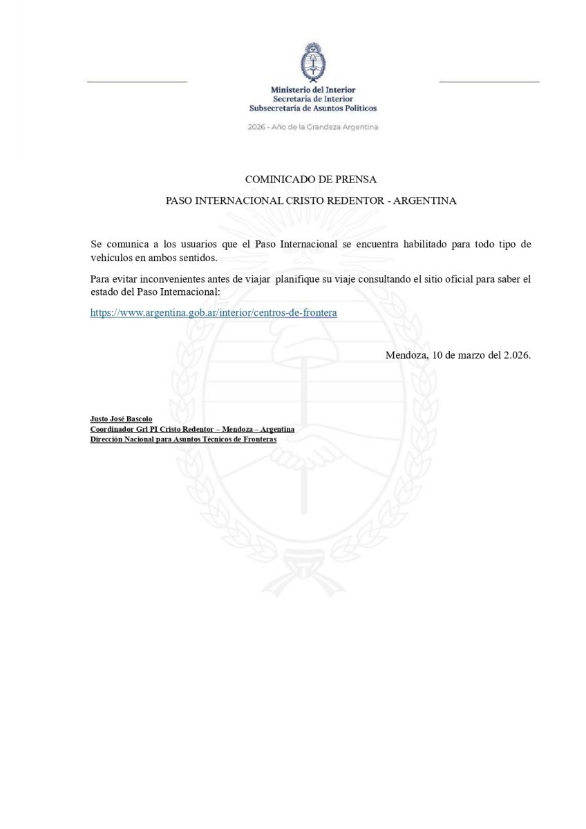 Paso Cristo Redentor: Habilitado las 24 horas.