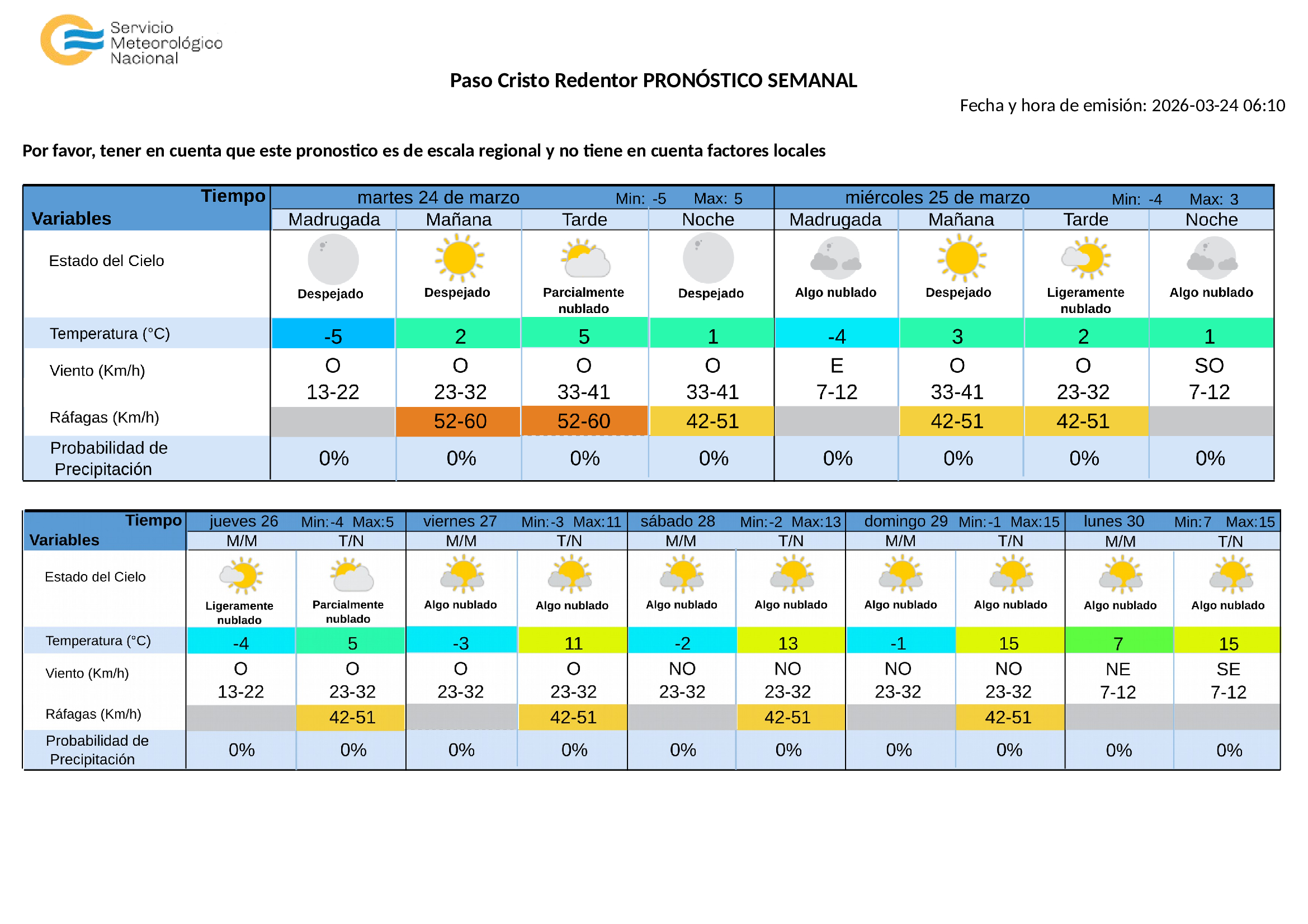 Pronóstico para hoy: Cielo cubierto por la mañana, nubosidad en disminución hacia la tarde. Descenso de la temperatura con vientos moderados a algo fuertes del sector sur en la madrugada.