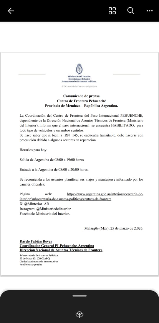 Paso Pehuenche: Habilitado de 8 a 20.