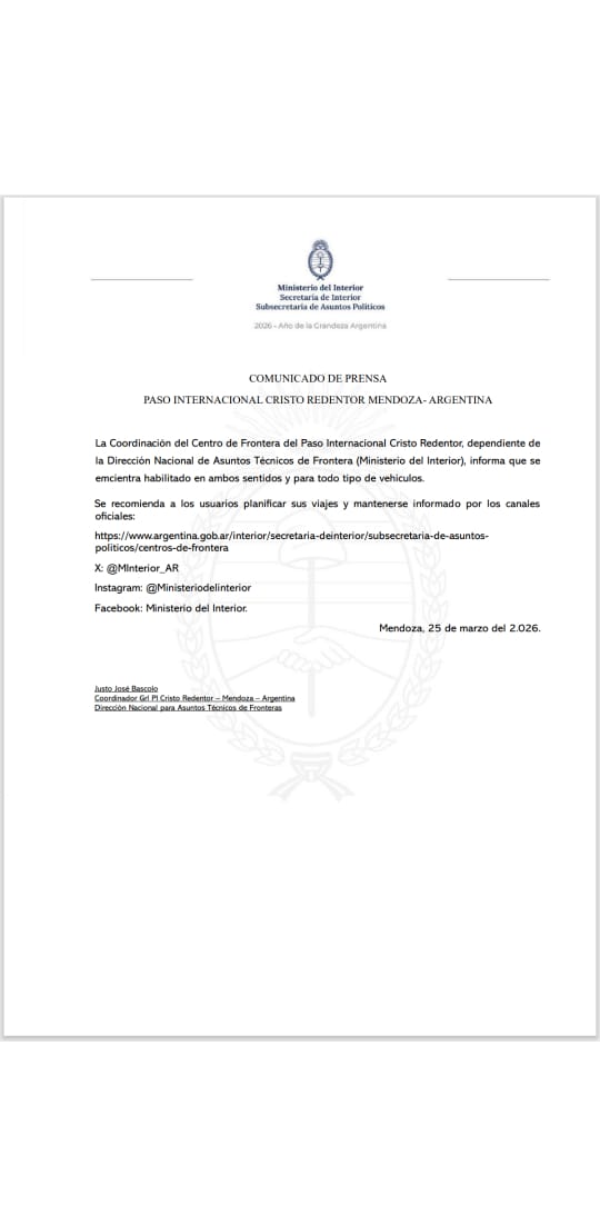 Paso Cristo Redentor: Habilitado para transporte de cargas, ómnibus y particulares.