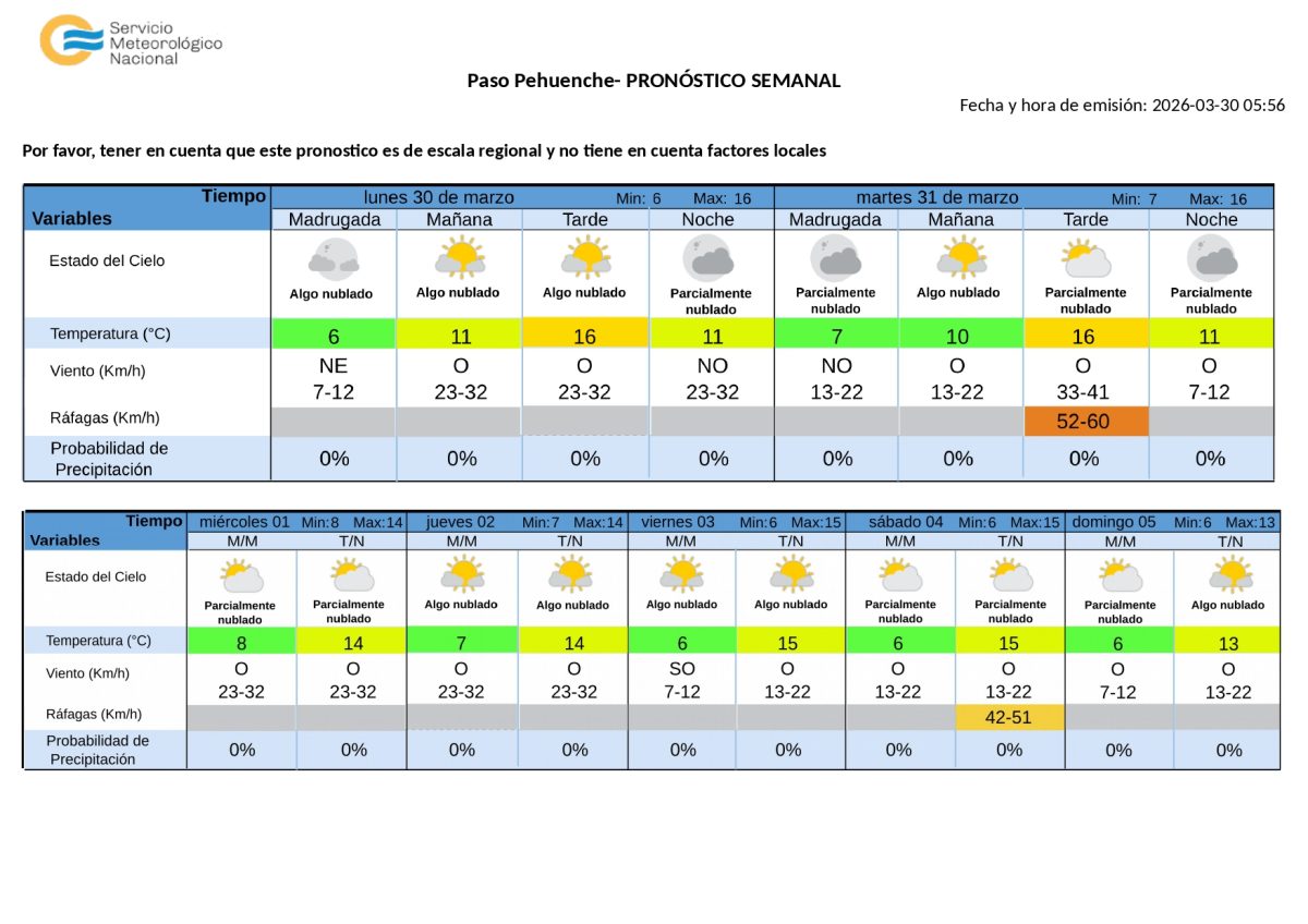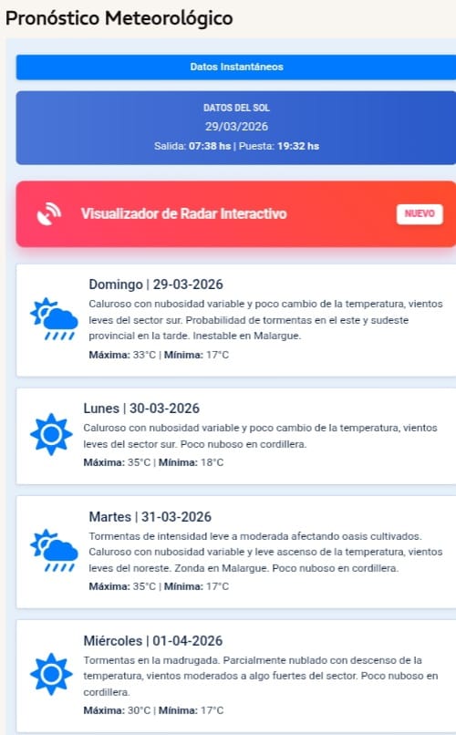 Nubosidad: Amanece seminublado. Desde las 16 se prevé inicio de convección en el Oeste del Gran Mendoza y Oeste de la zona Sur, extendiéndose hacia el Valle de Uco, zona Sur y posteriormente zona Este. Es muy probable la ocurrencia de lluvias en el Gran Mendoza a partir de las 21, extendiéndose a toda la provincia durante la madrugada. En el Sur provincial las tormentas podrían ser más intensas, no se descarta la caída de granizo.