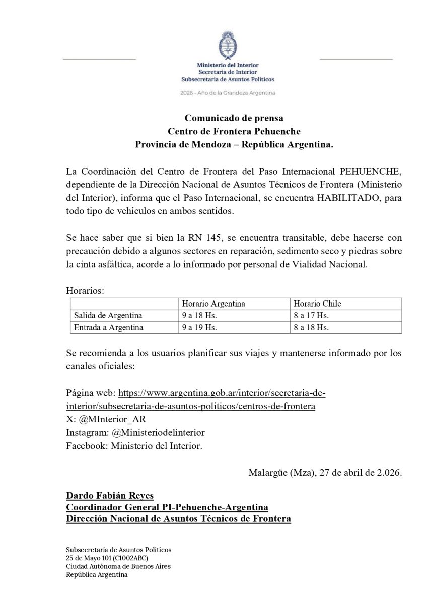 Paso Pehuenche: Habilitado de 9 a 19.