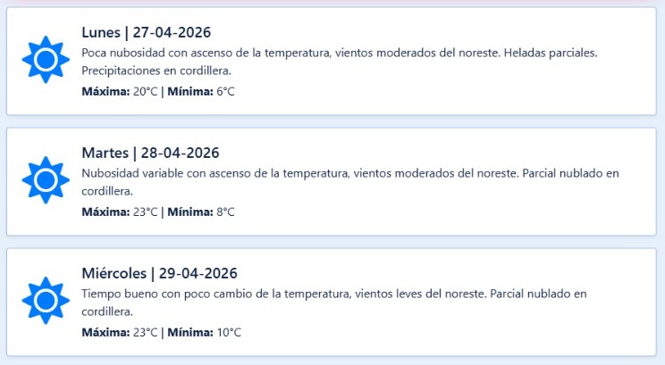 Alta Montaña: Cielo seminublado durante la mañana en la zona Sur. A partir de las 14, aumento de la nubosidad, con inicio de precipitaciones moderadas desde las 16 en la cordillera sur, que se extienden progresivamente hacia la zona Centro.