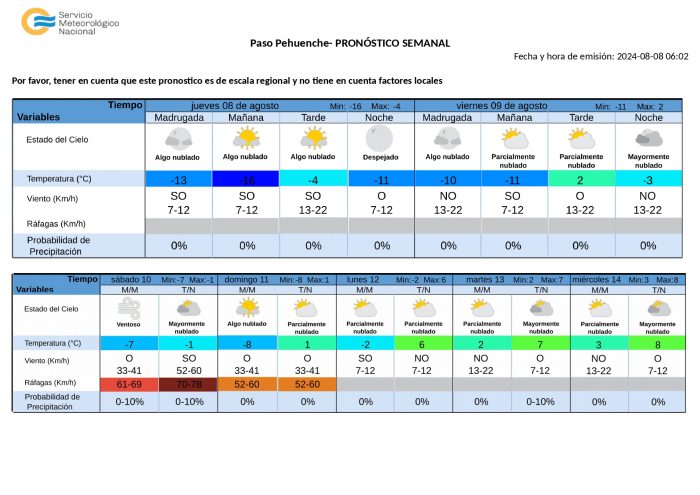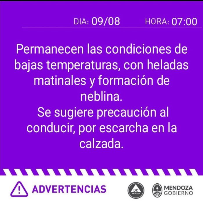 Viento: A partir de las 4, leve circulación de norte a sur en el Norte, Este y Sur, hasta las 16 aproximadamente. Simultáneamente, a partir de las 4, circulación de viento con efecto Zonda en precordillera, frente a Valle de Uco. Luego, afectaría a la zona Sur, principalmente sur de Malargüe. Esta situación perduraría hasta las 18 aproximadamente. Desde las 16, ingreso de viento moderado y permanente de sur a norte en zona Sur. Luego. Aproximadamente a las 18, afectaría la zona Este y el Valle de Uco hasta las 22.