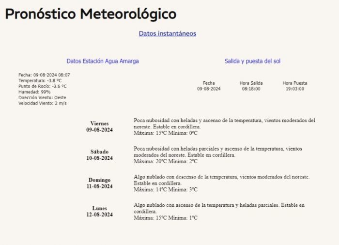Alta Montaña: Desde las 15 nublado, con probabilidades de precipitaciones débiles en cordillera sur de Malargüe hasta las 21. Luego, seminublado y sin precipitaciones.