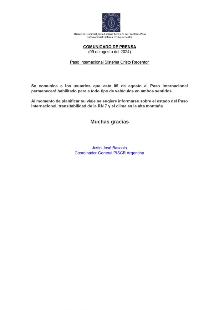 Sistema Integrado Cristo Redentor: Habilitado de 9 a 21 para transporte cargas, ómnibus y particulares, con portación obligatoria de cadenas.