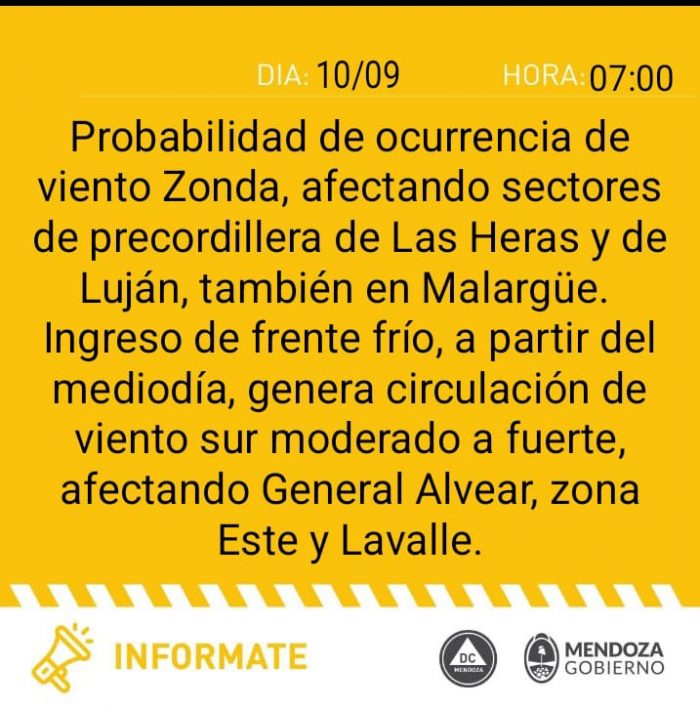 Viento: Probabilidad de viento Zonda a partir de las 12 en zona de Uspallata, Lavalle, Malargüe, con velocidades promedio de 35 km/h y, a partir de las 14, en zona de Gran Mendoza, que se extiende hasta la precordillera con velocidades también de 35 a 40 km/h. Luego ingresaría el frente Sur a partir de las 13 en el Sur provincial. Posteriormente, en Valle de Uco, zona Este y Norte de la provincia, a partir de la 1, que neutralizaría al viento Zonda. Este viento sur se hace sentir con más intensidad en las zonas Este y Sur de Malargüe, con velocidades promedio de 35 km/h y con menor intensidad en los demás sectores provinciales.