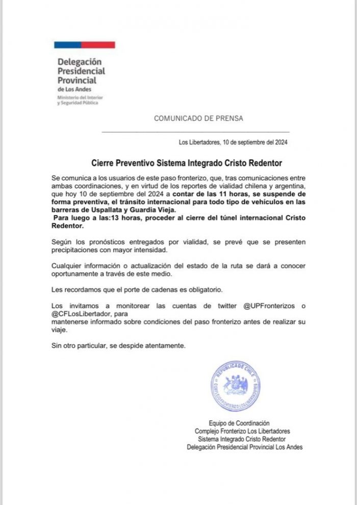 Sistema Integrado Cristo Redentor: Habilitado las hasta las 13 horas, con portación obligatoria de cadenas, para transporte de cargas, ómnibus y particulares.