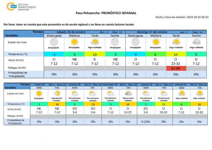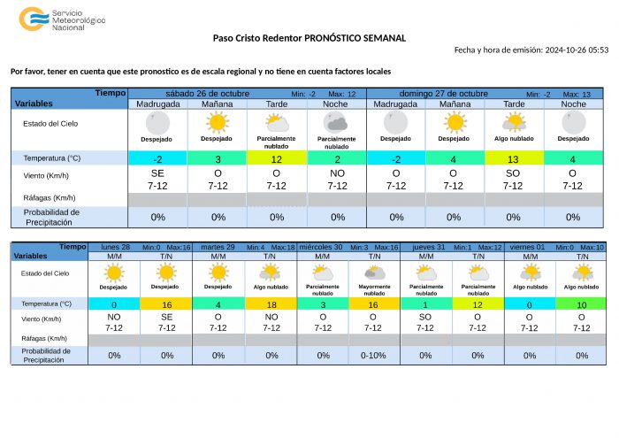 Vientos: Circulación moderada del norte se inicia a media mañana hasta cerca de las 20. Alrededor de las 12, se registrarían velocidades promedio de 35 km/h. y afectaría las zonas Norte, Este y Sur de la provincia, con mayor incidencia en zona Este.