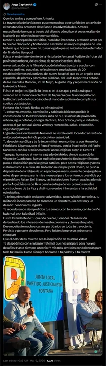 “Fuiste el mejor testigo de tu tiempo en obras que perdurarán para siempre en la memoria colectiva de tu pueblo que te acompañó con lealtad a través del voto dándote el mandato sublime de cumplir sus sueños postergados. ¡Te recordaremos siempre! Con tus enojos, con tu sonrisa, con tu cariño fraternal, con tu lealtad infinita”, posteó Capitanich en sus redes.