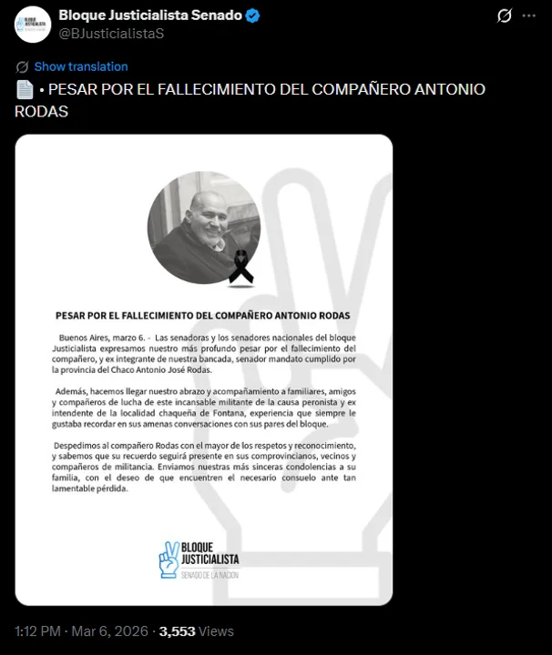 “Despedimos al compañero Rodas con el mayor de los respetos y conocimiento, y sabemos que su recuerdo seguirá presente en sus comprovincianos, vecinos y compañeros de militancia. Enviamos nuestras más sinceras condolencias a su familia, con el deseo de que encuentren el necesario consuelo ante tan lamentable pérdida”.