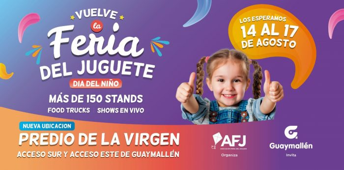 • Feria del Juguete del Día del Niño – Organizada por la Asociación de Feria del Juguete, con invitación de la Municipalidad de Guaymallén. Del 14 al 17 de agosto, en el Predio de la Virgen (Acceso Sur y Acceso Este), con los siguientes horarios: