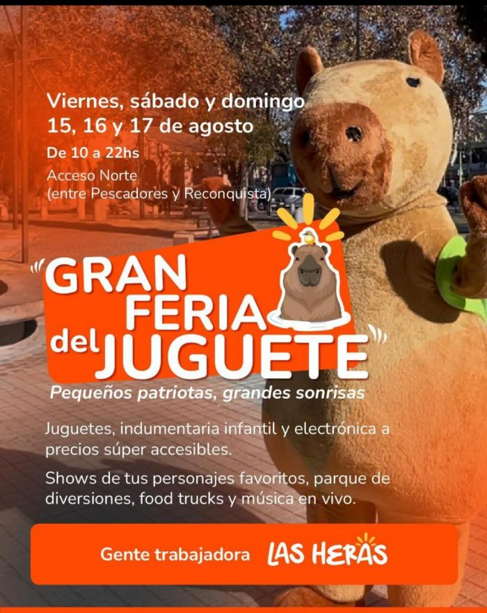 • Gran Feria del Juguete – Organizada por la Municipalidad de Las Heras. Del 15 al 17 de agosto, de 10 a 22, en el Acceso Norte entre Pescadores y Reconquista, Las Heras.