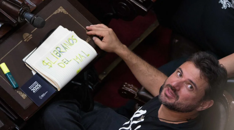 El diputado de Unión por la Patria apareció en el recinto con un cartel que decía: “Líbranos del mal”.