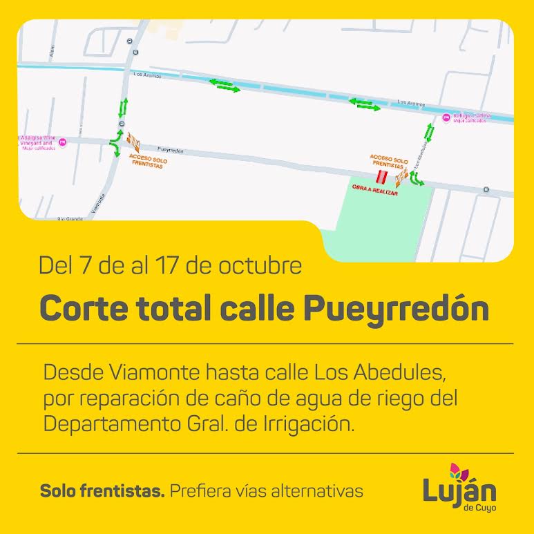 Desde este lunes 7 hasta el jueves 17 de octubre, se realizará un corte total de calzada sobre Pueyrredón, en el tramo comprendido entre calles Los Abedules y Viamonte. La interrupción obedece a la ejecución de los trabajos de refacción general del caño principal de agua de riego que posee la Irrigación en esa importante arteria de Chacras de Coria.