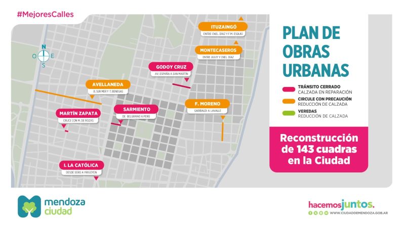 La Ciudad de Mendoza informa el estado actual de las calles que se encuentran intervenidas con trabajos de reconstrucción de calzadas y mejoras en veredas. Estas acciones forman parte del Plan de Obras Urbanas, que contempla la renovación integral de distintas arterias y espacios públicos, en el marco de un cronograma de obras estratégicas para mejorar la transitabilidad y la infraestructura urbana.