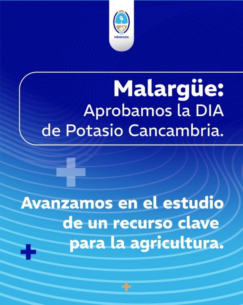 La Autoridad Ambiental Minera (AAM) —integrada por la Dirección de Minería y la Dirección de Gestión y Fiscalización Ambiental del Ministerio de Energía y Ambiente— aprobó la Declaración de Impacto Ambiental (DIA) para la etapa de prospección del proyecto de sales de potasio Potasio Cancambria, en el departamento de Malargüe.