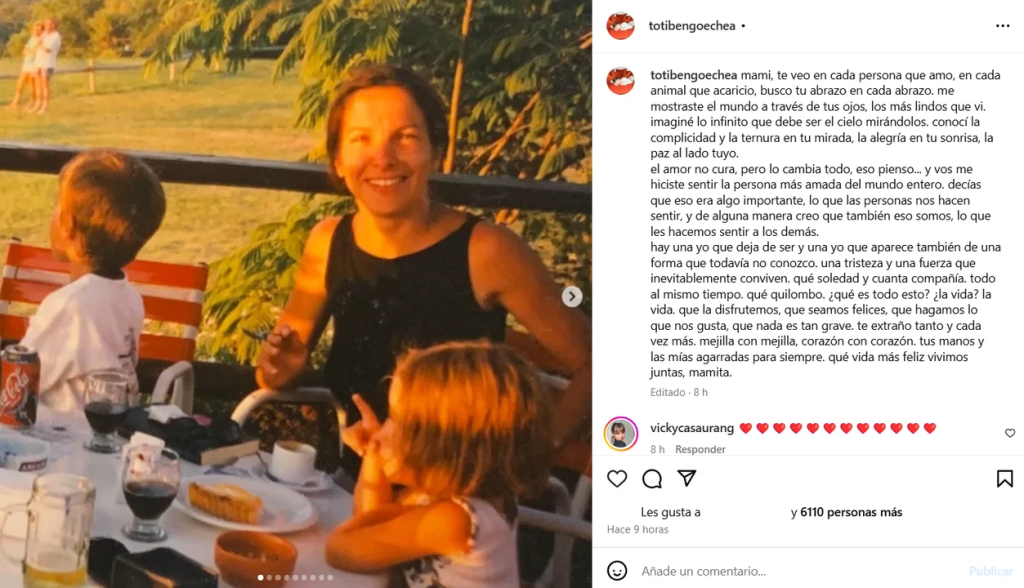 “¿Qué es todo esto? ¿La vida? La vida. Que la disfrutemos, que seamos felices, que hagamos lo que nos gusta, que nada es tan grave. Te extraño tanto y cada vez más. Mejilla con mejilla, corazón con corazón. Tus manos y las mías agarradas para siempre. Qué vida más feliz vivimos juntas, mamita”, concluyó.