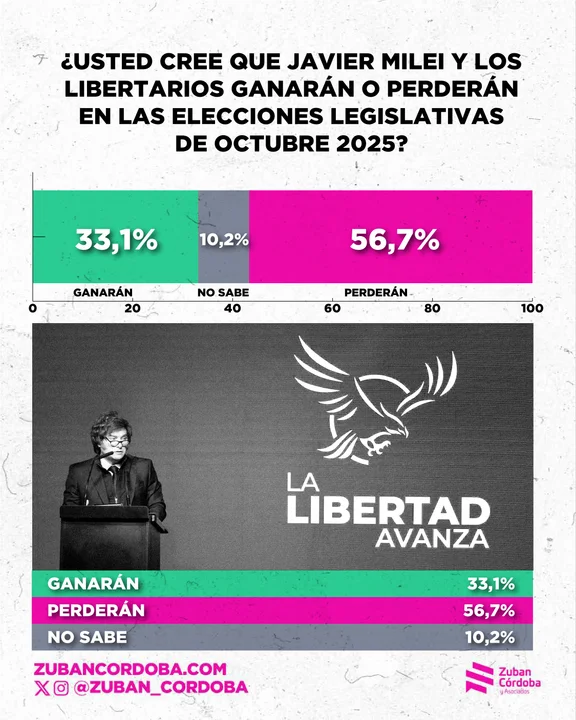 Pesimismo electoral: la mayoría cree que Milei pierde en octubre La desconfianza en el rumbo del Gobierno se traslada al escenario electoral de las legislativas del 26 de octubre. Según la encuesta, un 56,7% de los argentinos cree que Javier Milei y los libertarios perderán las elecciones, frente a un 33,1% que opina que ganarán.