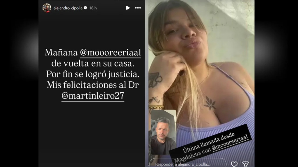 “Última llamada desde Magdalena con @mooreeriaal”, escribió Cipolla al publicar la foto de la influencer en prisión.