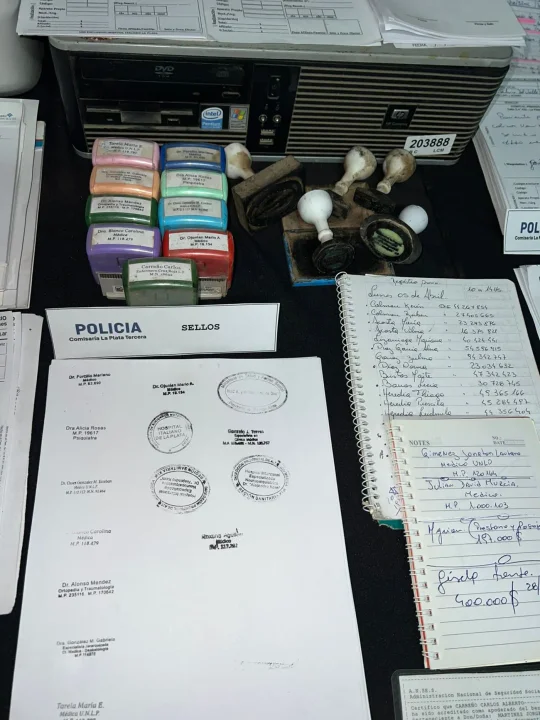 En el domicilio se encontraron certificados médicos truchos de los hospitales Italiano, San Juan de Dios, el Sudamericano y la UPA de Los Hornos, todos con sellos y firmas de médicos en actividad. Además, se secuestraron sellos profesionales, órdenes médicas en blanco, una impresora y documentación que indicaba los valores cobrados por cada certificado, que llegaban hasta los 65.000 pesos.