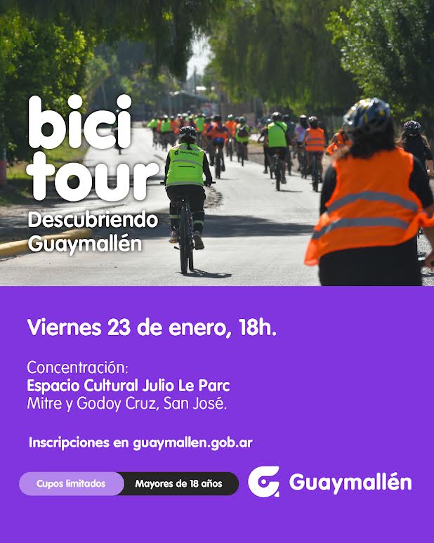 El próximo viernes 23 de enero se llevará a cabo el primer “Bicitour descubriendo Guaymallén” del 2026, una propuesta que invita a pedalear y conocer los lugares más representativos del departamento. La concentración será a las 18h en el Espacio Cultural Julio Le Parc (Mitre y Godoy Cruz), y finalizará alrededor de las 20h en la Estación Saludable (Allayme y Lateral Norte de Acceso Este).