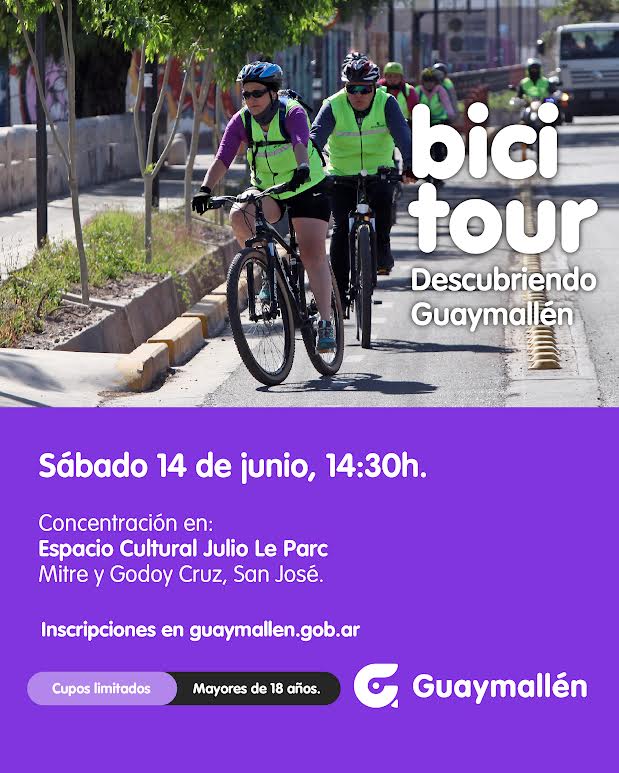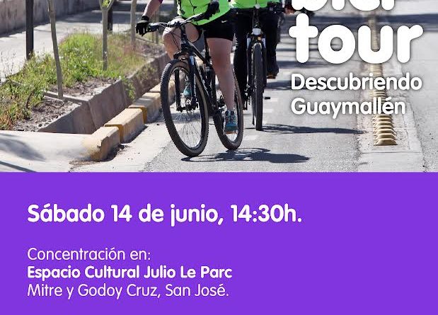 La Municipalidad de Guaymallén organiza una nueva edición del “Bicitour, descubriendo Guaymallén”. En esta ocasión el recorrido iniciará en el Espacio Cultural Julio Le Parc (Mitre y Godoy Cruz, San José), el próximo sábado 14 de junio, a partir de las 14:30h.
