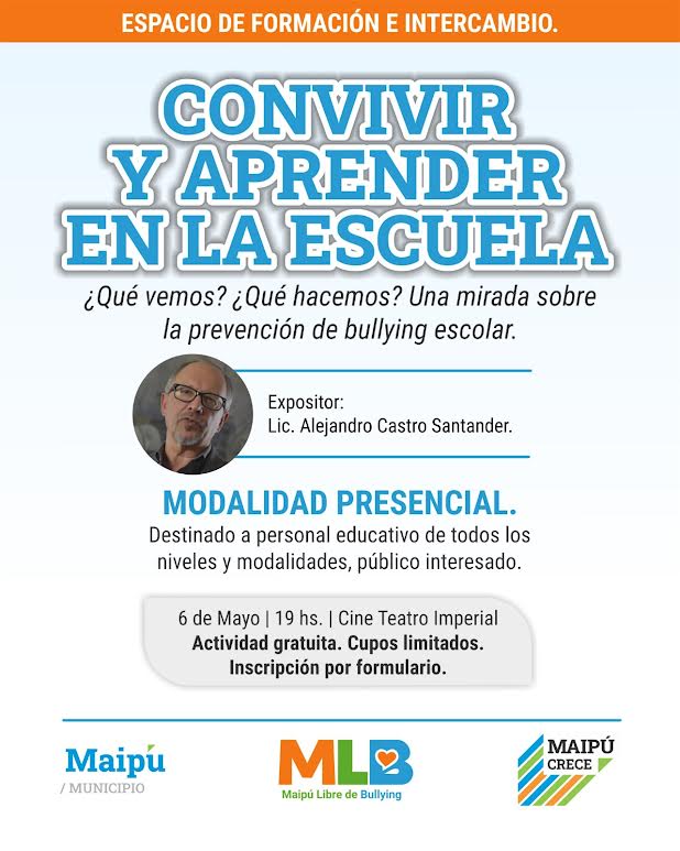 En un contexto atravesado por situaciones que generan preocupación en el ámbito educativo —como la reciente viralización de amenazas en escuelas en distintos puntos del país y también en Mendoza—, la Municipalidad de Maipú redobla su compromiso con la convivencia escolar y la construcción de entornos seguros. Lo hace con una nueva convocatoria abierta a toda la comunidad: la charla “Convivir y aprender en la escuela: qué vemos, qué hacemos”, a cargo del especialista Alejandro Castro Santander.