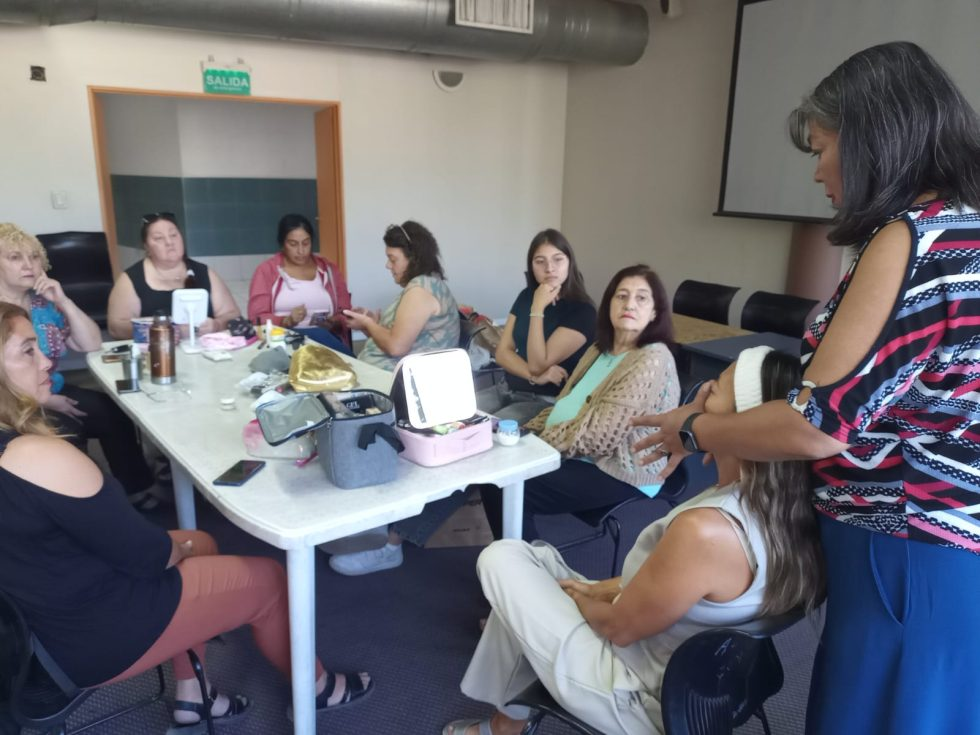 La licenciada Eliana Silveti, psicóloga del grupo, fue la primera en participar del trabajo de Roxana. Masajes sobre las líneas de expresión y limpieza facial dieron inicio a la sesión. Luego llegó el maquillaje, acompañado de explicaciones paso a paso. Otras diez personas siguieron atentamente la clase, incorporando nuevos conocimientos en un clima de compañerismo y contención. También participaron la licenciada Gabriela Rivara y el profesor Javier Domínguez, sumando su aporte a una jornada muy especial.