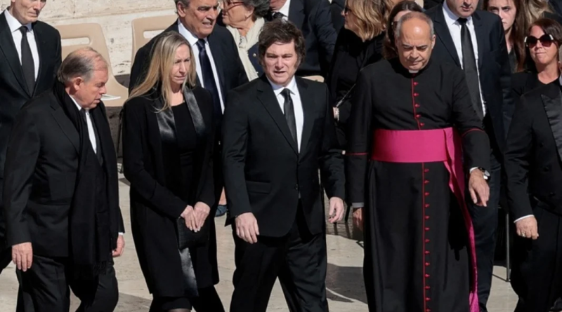 Durante el funeral, Milei encabezó la delegación argentina junto a su hermana Karina Milei, y estuvo ubicado junto a Meloni, quien estuvo acompañada por el presidente de Italia, Sergio Mattarella.