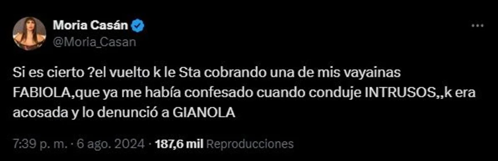Moria Casán publicó en su cuenta de X un tweet en referencia a la denuncia de Yañez a Fernández: “¿Si es cierto? El vuelto que le está cobrando una de mis vayainas Fabiola” y agregó: “Ya me había confesado, cuando conduje Intrusos, que era acosada y lo denunció a Fabián Gianola”, reveló.