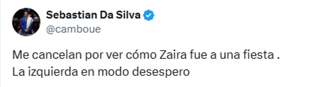 - Defensa en redes: «Me cancelan por ver cómo Zaira fue a una fiesta. La izquierda en modo desespero», disparó el senador desde su cuenta oficial [@camboue].