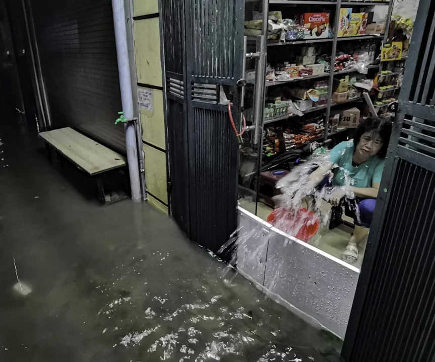 Una mujer desagota su negocio inundado en Hanoi. Fotografía: Agencia Noticias Argentinas / Xinhua