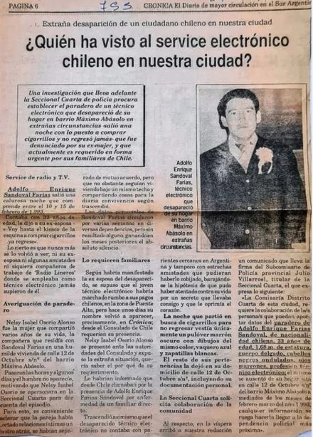 El insólito episodio ocurrió en las últimas horas cuando la Policía de la provincia fue hasta el domicilio de Adolfo Enrique Sandoval Farías, de nacionalidad chilena, luego de que la Jefa de la División de Búsqueda de Personas obtuviera un dato importante 30 años después.
