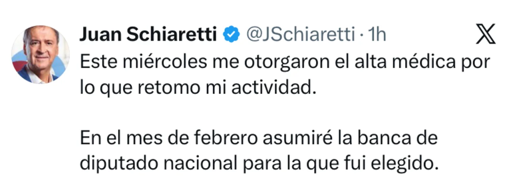 “Este miércoles me otorgaron el alta médica por lo que retomo mi actividad. En el mes de febrero asumiré la banca de diputado nacional para la que fui elegido”, confirmó el ex candidato presidencial a través de su cuenta en la red social X.