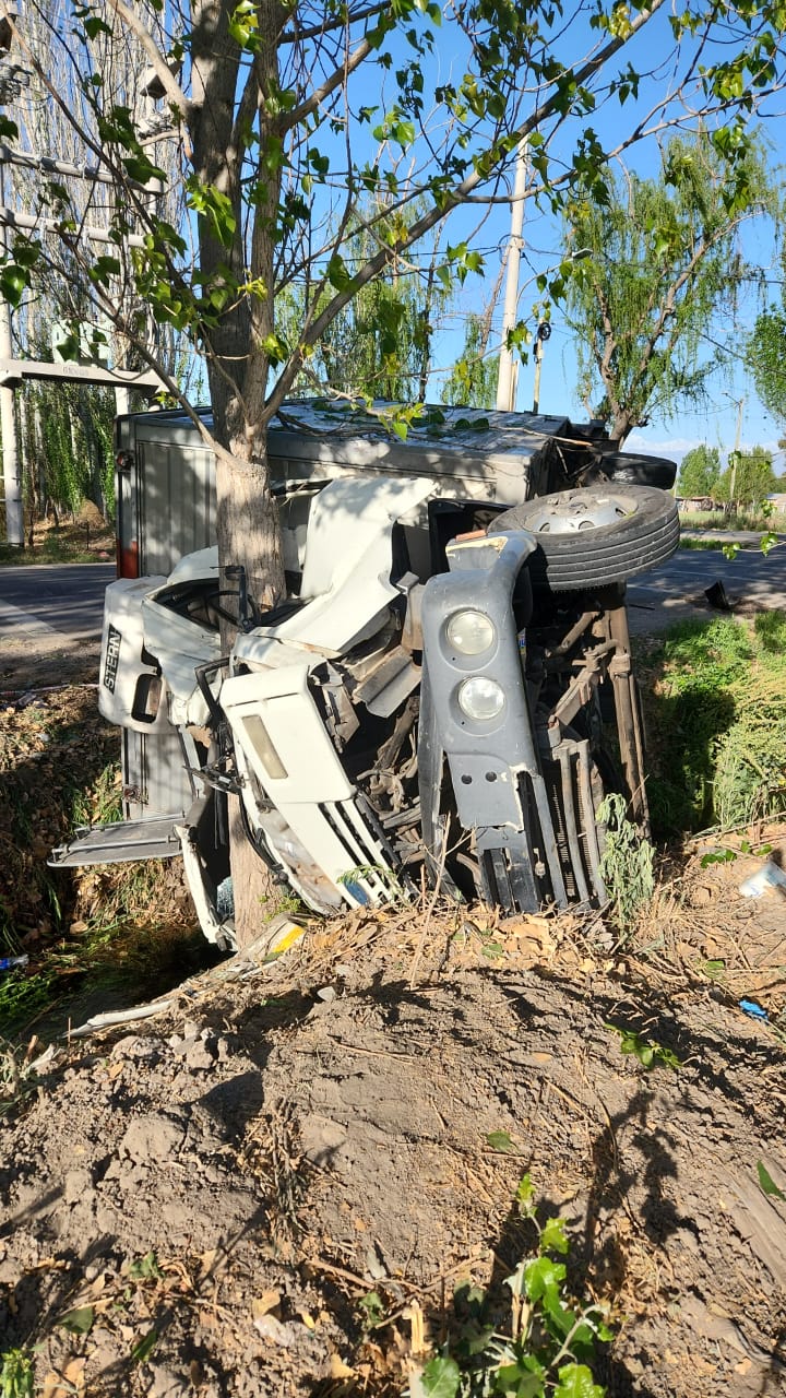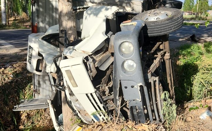 por razones que desconoce lo embiste, volcando el camión sobre calle