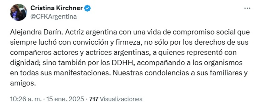 «Alejandra Darín. Actriz argentina con una vida de compromiso social que siempre luchó con convicción y firmeza, no solo por los derechos de sus compañeros actores y actrices argentinas, a quienes representó con dignidad; sino también por los DDHH, acompañando a los organismos en todas sus manifestaciones,» escribió Cristina Kirchner en su cuenta oficial de Twitter.