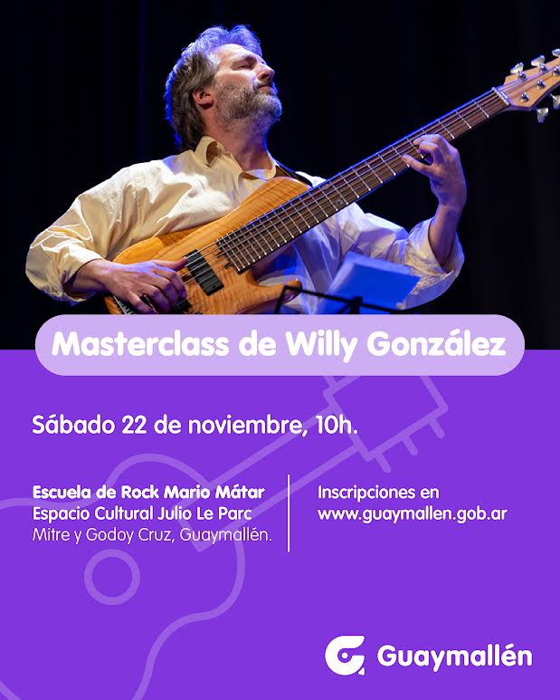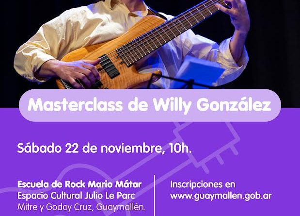 La Escuela Municipal de Rock Mario Mátar invita a participar de una masterclass gratuita a cargo del reconocido músico y compositor argentino Willy González. Se realizará el sábado 22 de noviembre, a las 10h, en el auditorio Goy Ogalde de la escuela, ubicada en el predio exterior del Espacio Cultural Julio Le Parc (Mitre y Godoy Cruz de Guaymallén). La actividad está dirigida a músicos, estudiantes y público interesado, con cupos limitados e inscripción previa.